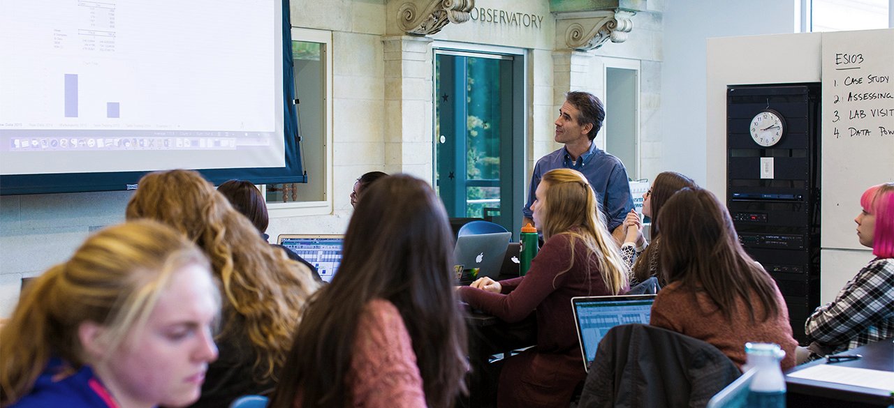 Geosciences professor works with students in the specialty classroom.