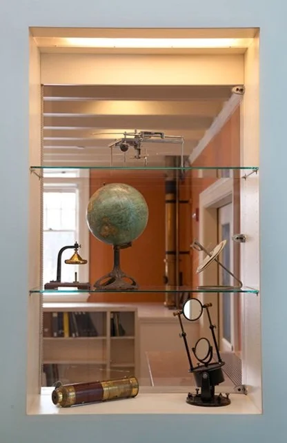 Those weren’t the only things lost then rediscovered as we dug through the observatory's past: Out of necessity, a hallway had carved up the original photographic room. Once removed, it was revived as a small study & meeting space. In the library, a series of tall metal shelves was removed so the space could function as a seminar room once again. Books still line the room in low shelves at the perimeter, which freed up space for the original wood table and a new rug that even Mrs. Whitin would be proud of. And finally, the original entry door, long abandoned and anchored shut, is now a memorable part of the new specialty classroom. (The rug selection process involved trips to the Boston showroom where several options were selected to try in the space. I remember well the day they were delivered to the observatory and unrolled. The delegation stared at the ground for hours! An antique Ferhan was chosen for its intricate details, patina, and color.)