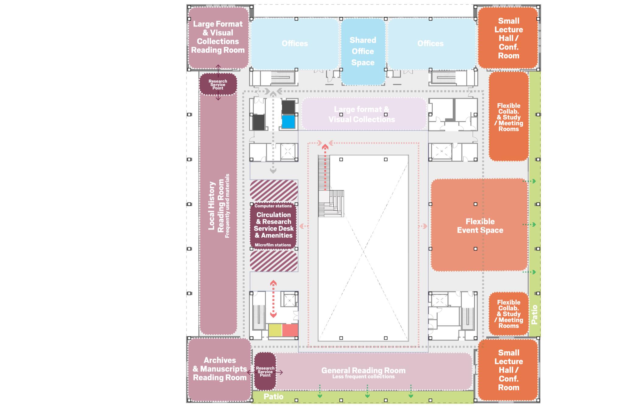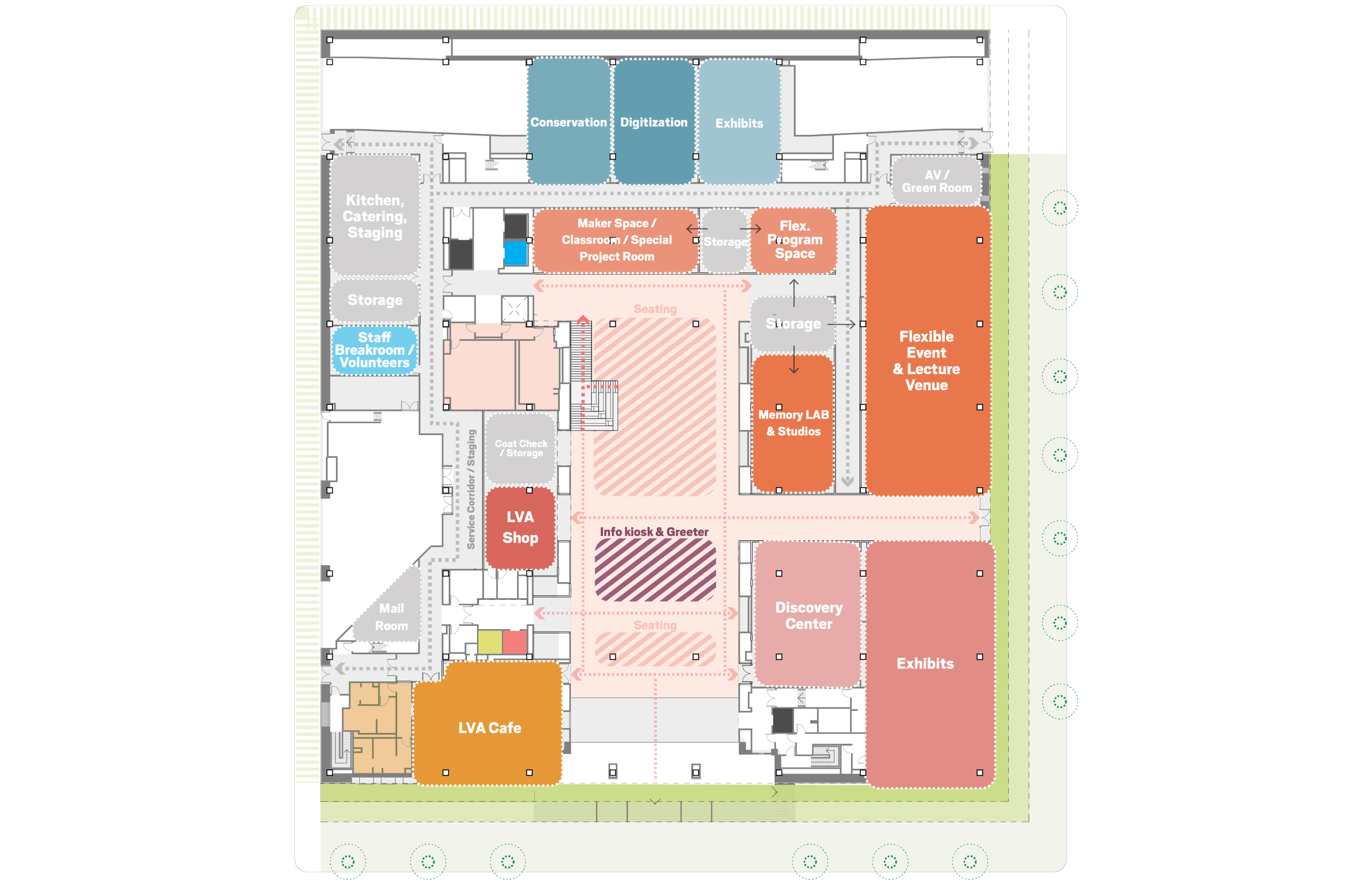 designLABβs master planning effortβ undertaken over the course of six months in 2023β outlines a comprehensive space plan for the first two floors of the Library that maximizes accessibility, improves visitor experience, and fosters engagement and interaction. Furthermore, the reorganization of existing spaces and introduction of new uses will activate the first and second floors to better engage and support the public. On the first floor, a new cafe and an expanded Exhibit Hall will engage Broad Street, inviting visitors in. A flexible (flat floor) Event and Lecture Venue will replace the current auditorium, supporting a wider variety of use. A new Memory Lab, Discovery Center and series of flexible program rooms will ring the large lobby, activating it like never before.