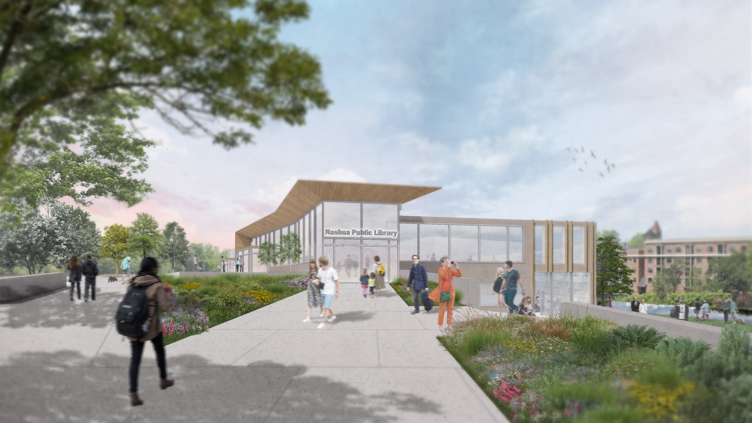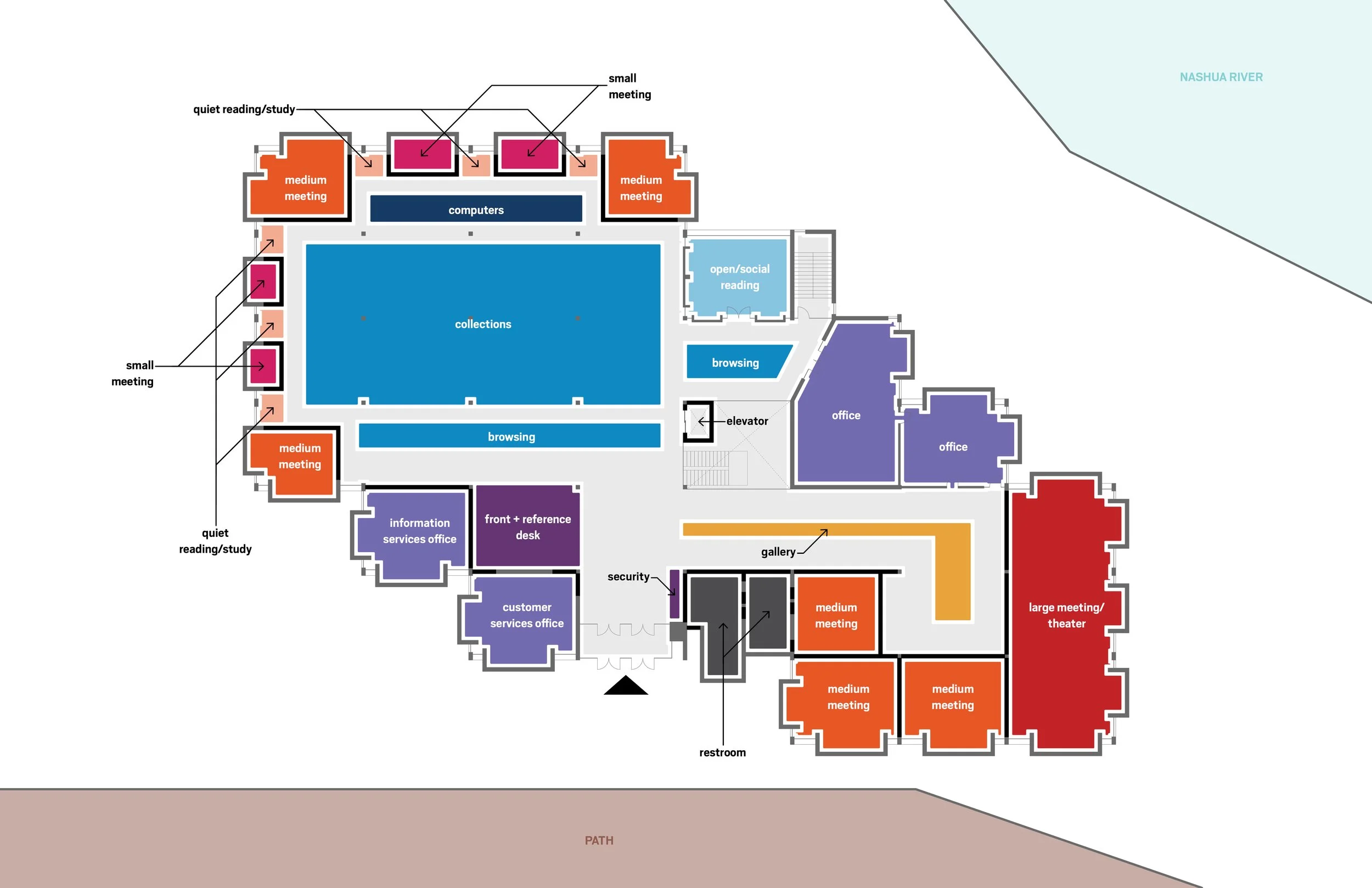 designLAB recently completed a program study and conceptual design for the future of the NPL Main Branch. The scope of investigations spans from renovation and addition options, to a full replacement of the library with a brand new building on an adjacent site. Built in 1970, the Nashua Public Library is a 57,000-square-foot building located along the banks of the Nashua River in downtown Nashua, NH. The building was constructed in a mid-century style, made of a cast-in-place exposed concrete frame with brick infills. At the time of its construction, the Nashua River was one of the most polluted rivers in the United States. As a result, the building βturned its backβ to the riverfront. While library services and resources, building and energy codes, and even the Nashua River have evolved over the past 50 years, the building has not. The study explores opportunities for expanding youth services, introducing more community meeting spaces (small and large), and improving accessibility. Furthermore, each solution unlocks better connections to the future riverwalk and downtown Nashua.