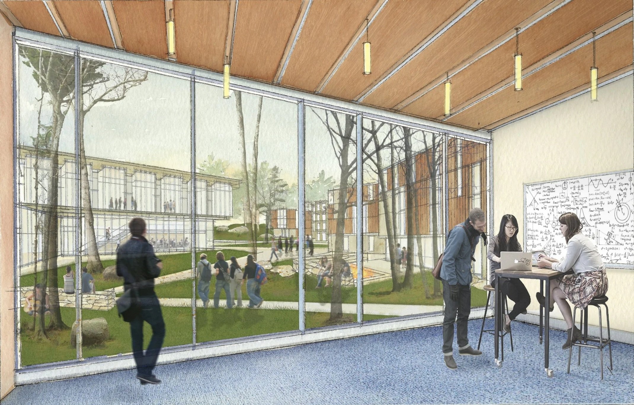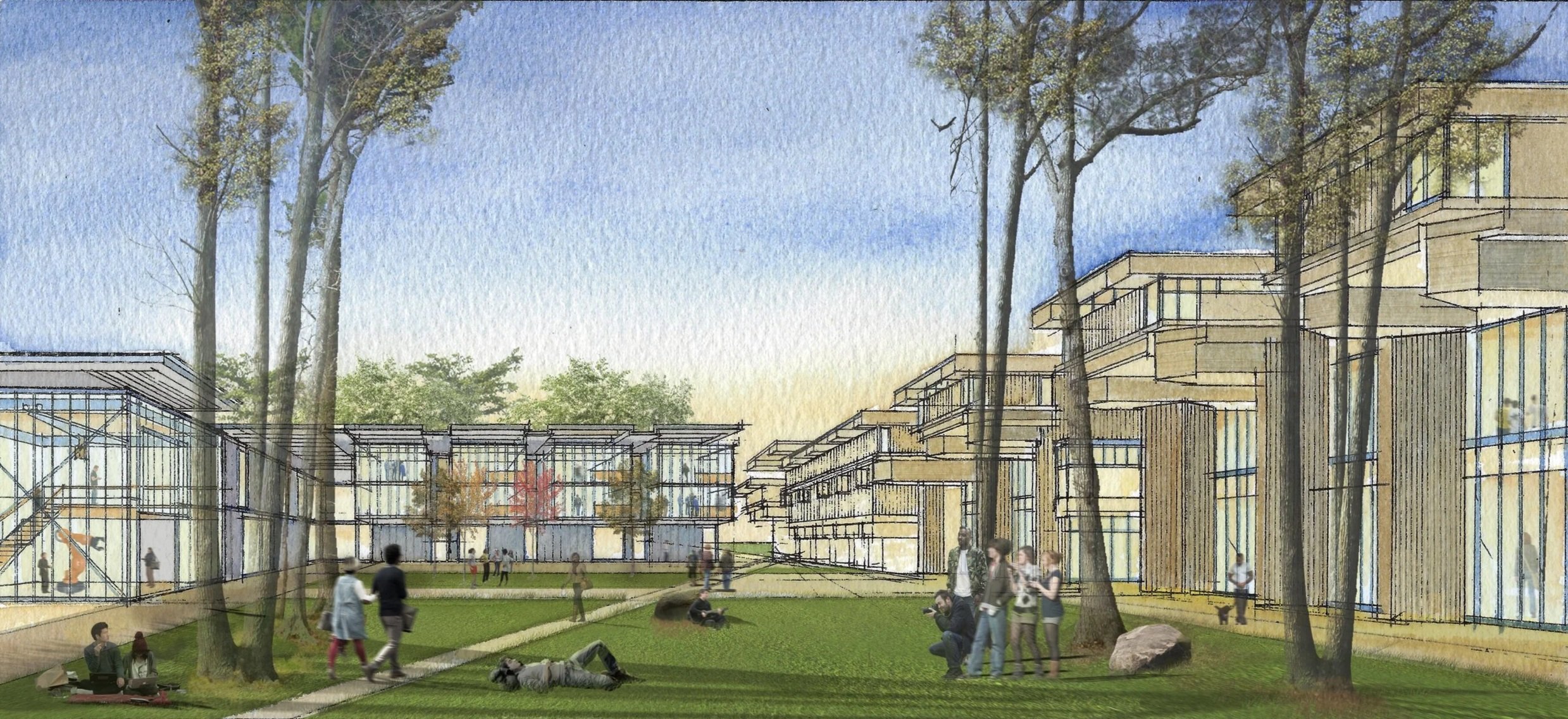 With the construction of the first-year commons and additional new sophomore and junior year commons, this quadrant provides an opportunity to create a new residential area set in the βwoodsβ but still connected to the core campus. A new woodland walk is created in the concentric pedestrian ring bordered by the new housing, and throughout the walk the ground level amenities of cafe, retail, and study and lounge spaces, animate the residential village.