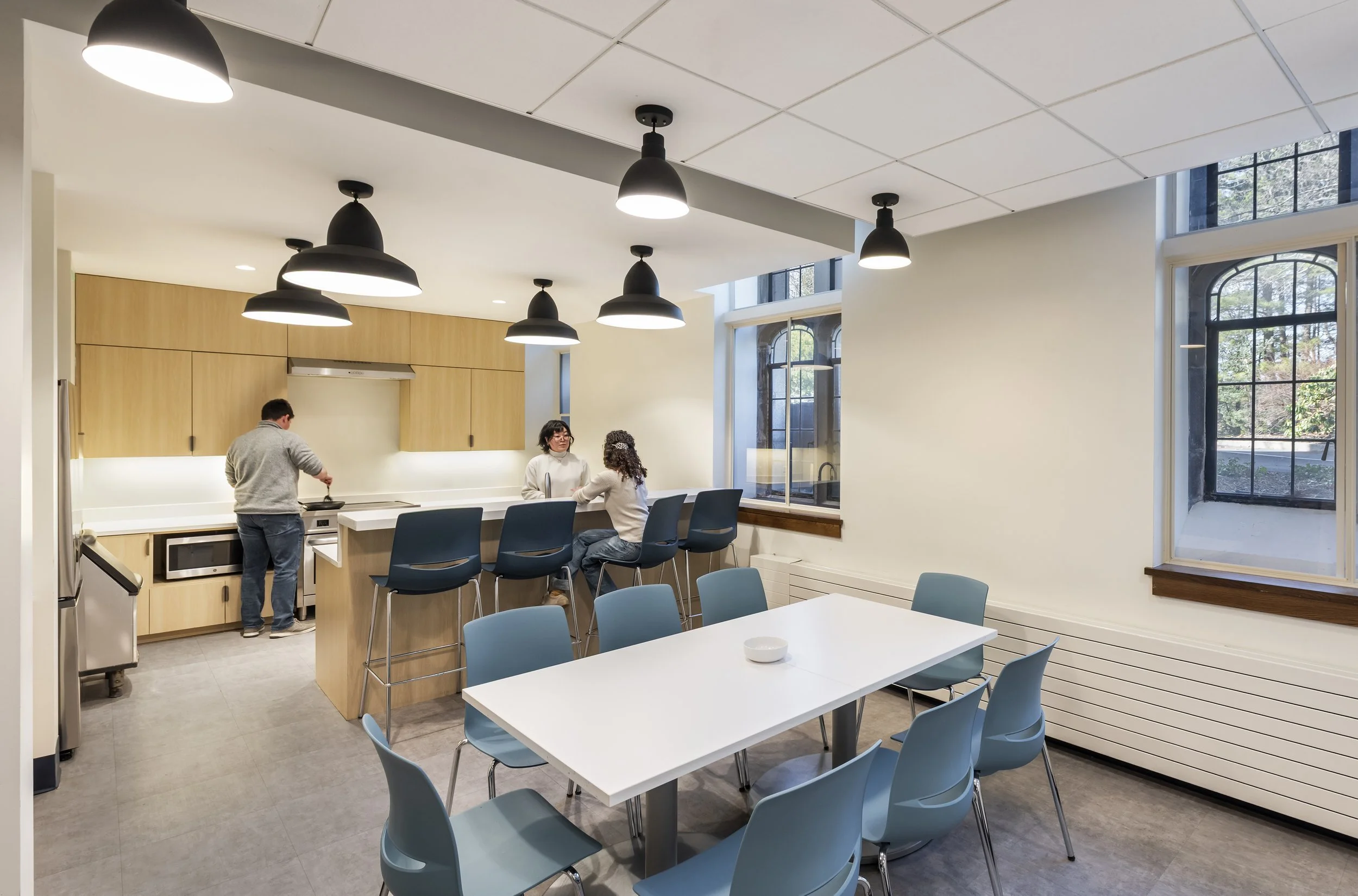 While the imperative was given to maintain the bed count and configuration of the dorms, with only a light-touch refresh of paint and flooring, the design team found numerous opportunities to improve shared student amenities. Under-utilized spaces were reclaimed as lounge and study areas within the residential corridors, while expanded kitchenettes foster collaborative cooking and eat-in seating. Additionally, spaces that were no longer serving their intended uses, such as the old mail room and telephone closets, were used to create new spaces, like a movement room, community kitchen, and film screening room. Each of these was achieved through light-touch finishes, furnishings, and selective equipment improvements, yet has a substantial impact on the studentsβ ability to step away from the rigors of study to build camaraderie and community.