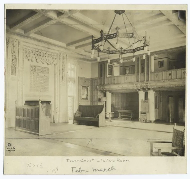 The design team identified an opportunity to create a celebrated new entry experience from the front elevation, connecting the lower-level Dining Hall with the Great Hall. An ornately carved wood door and handsome vestibule complement the historic setting. The lift is discreetly wrapped in wood paneling, so the Great Hall retains its grandeur, and the new infrastructure is integrated seamlessly. The new procession not only improves access across multiple spaces but also brings dignity to the entire accessible experience, creating a first impression that welcomes all visitors and feels distinctly Tower Court.