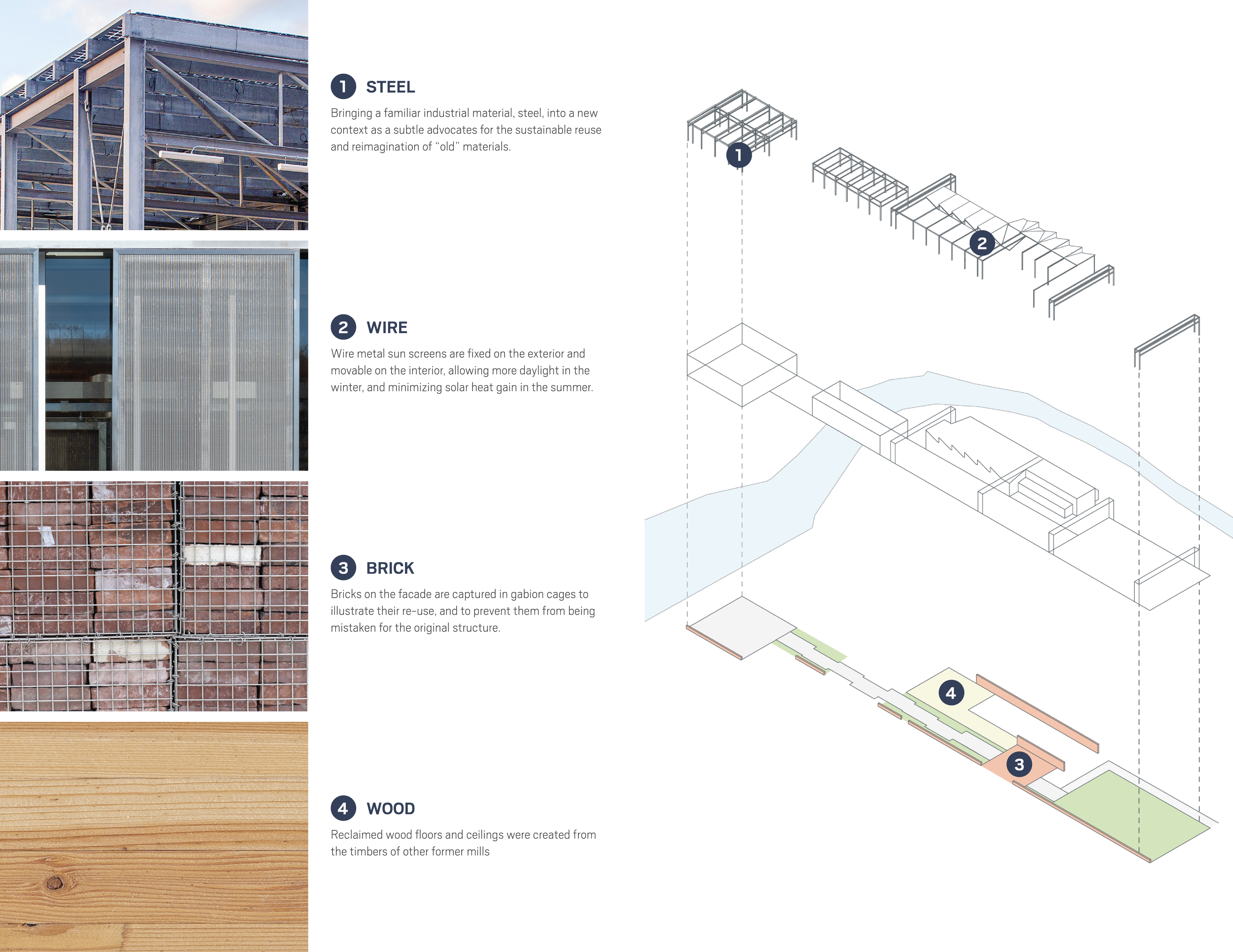 The building hosts a flexible learning space; an exhibit hall that celebrates local history; a large, grassy lawn with a support station for bicyclists; and a new pedestrian bridge that invites visitors to engage with the once badly polluted Blackstone Canal. Throughout, the building and site incorporate a wide range of materials recycled and reclaimed from other deconstructed mill buildings in the area, including the timber flooring and exterior bricks. The site is powered by renewable energy, utilizing a pellet boiler for heat and a PV array that doubles as the roof for a new events pavilion.